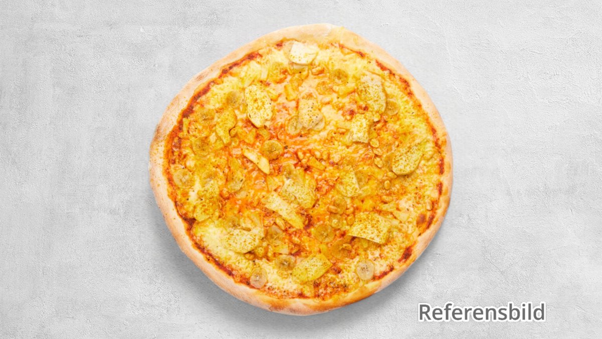 Tomatsås, ost, kyckling, ananas, banan och curry.