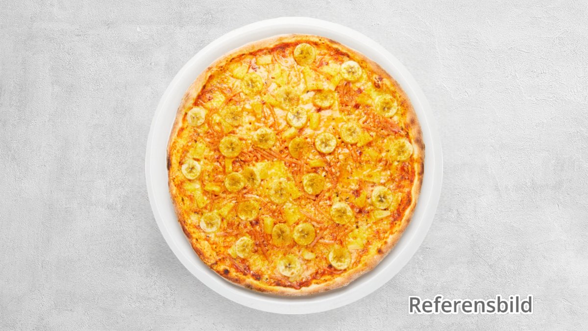 Tomatsås, ost, skinka, banan, ananas och curry.