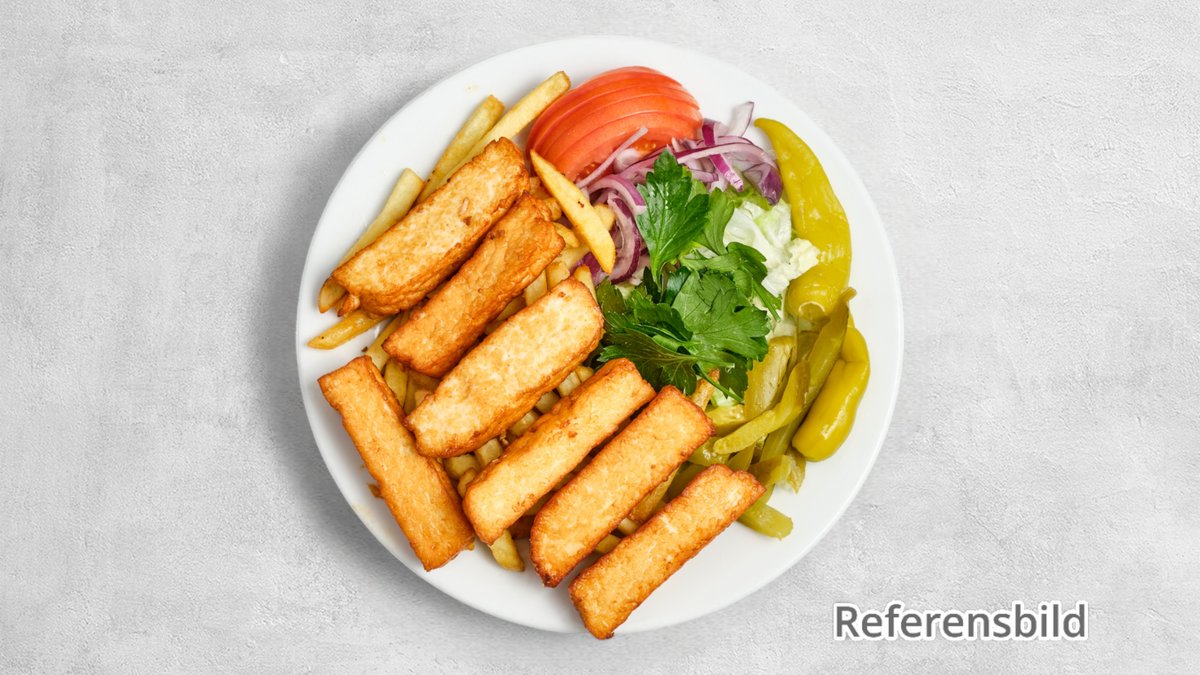 Serveras med pommes frites och 33 cl dryck.