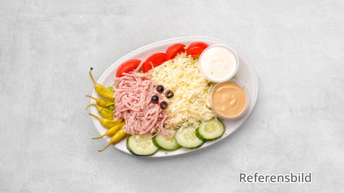 Kebabkött . Feferoni, Isbergssallad, Tomater, Mild kebabsås, Lök