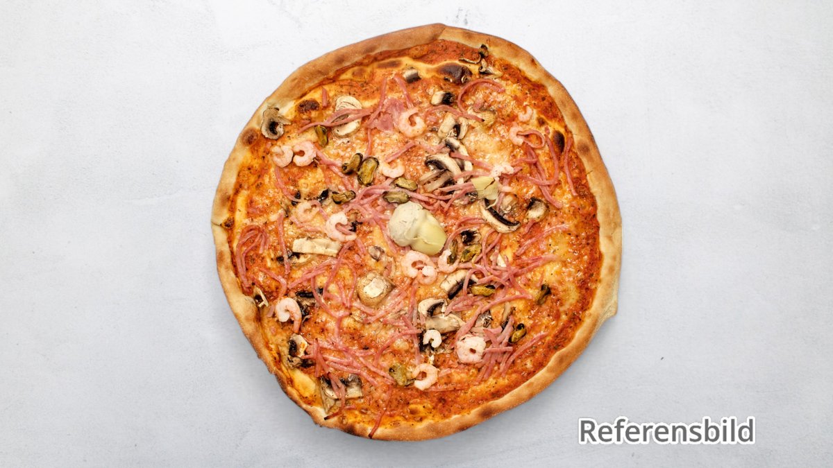 Tomatsås, ost, skinka, champinjoner och räkor.
