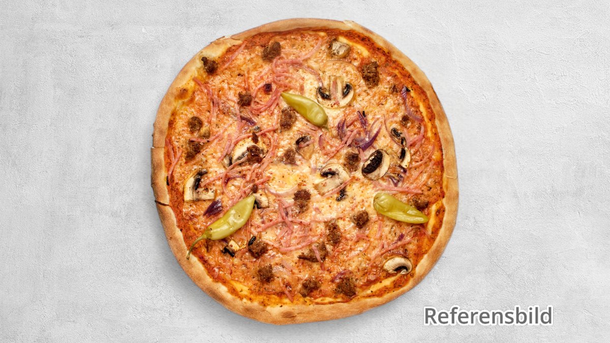 Tomatsås, ost, kebabkött, skinka, lök, feferoni och mild kebabsås.
