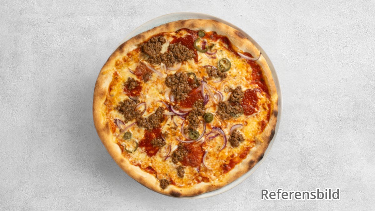 Tomatsås, ost, lök, färsk paprika, champinjoner, salami, köttfärs, jalapeños och tabasco.