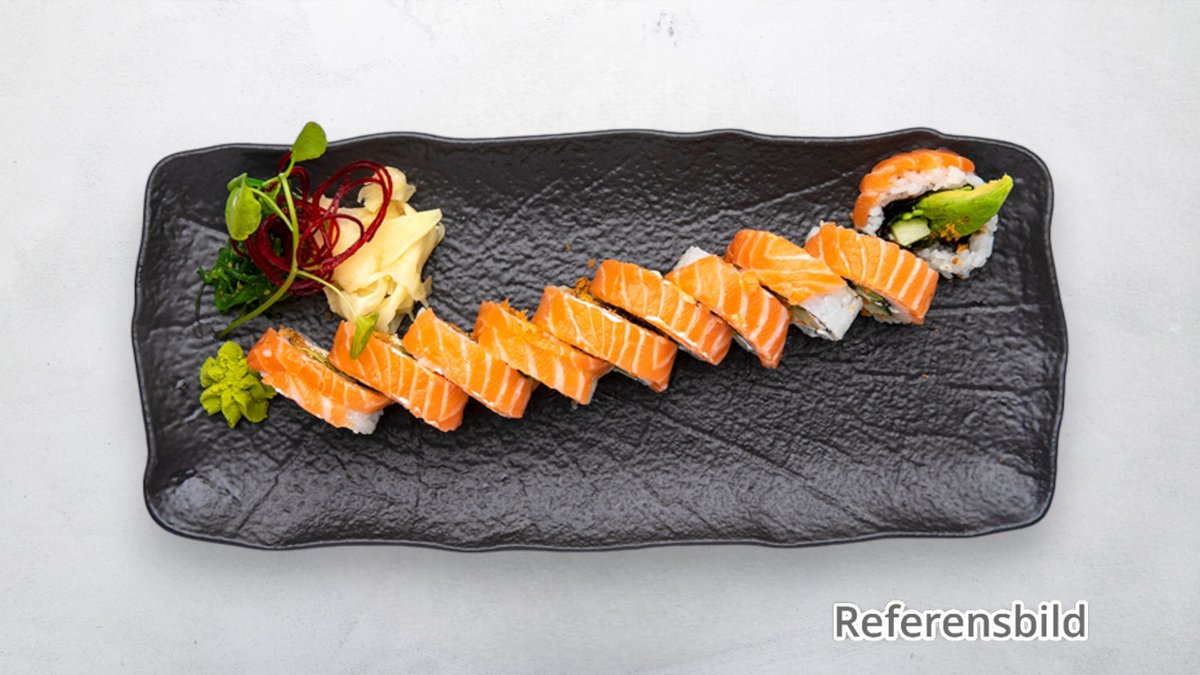 16 bitar. 6 maki, 5 lax, 1 krabba, 1 ål, 1 avokado, 1 tonfisk och 1 räka.