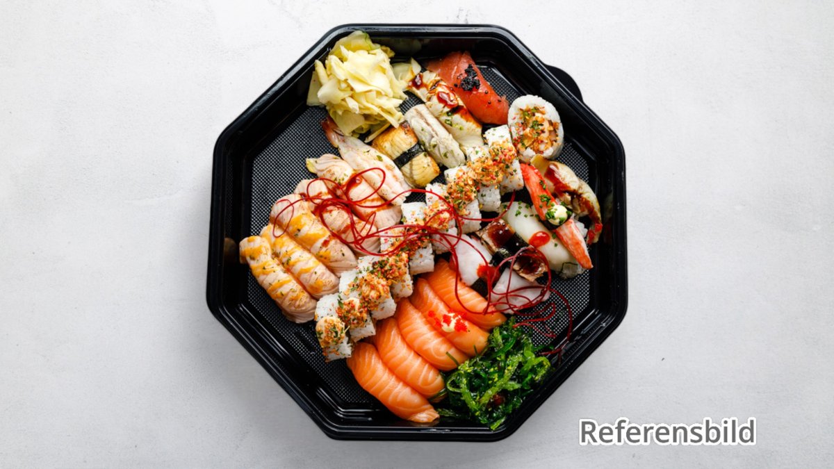 2 bitar sushi, 3 bitar rullar, ris, sallad, nötkött, 2st yakitori spett, teriyakisås och sesamfrön.
