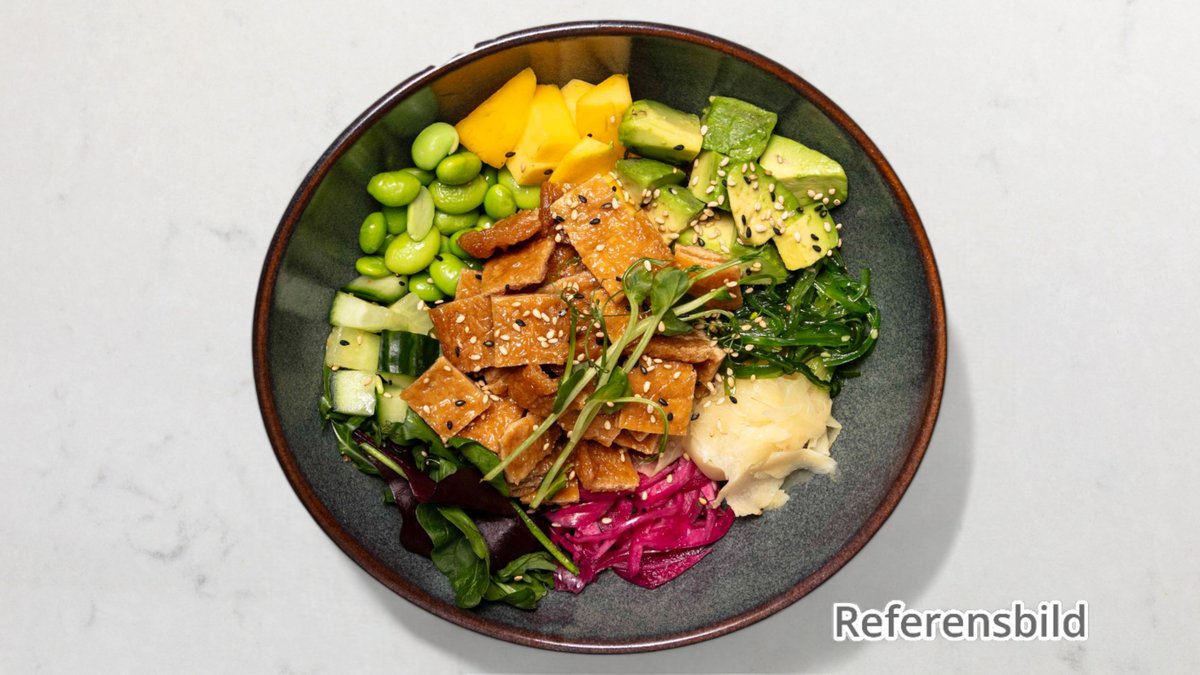 Ris, mango, ingefära, avokado, sjögrässallad, morot, cocktailtomater, sesamfrö, gurka, sojabönor, spetskål, rödkål, toppad med såser.
