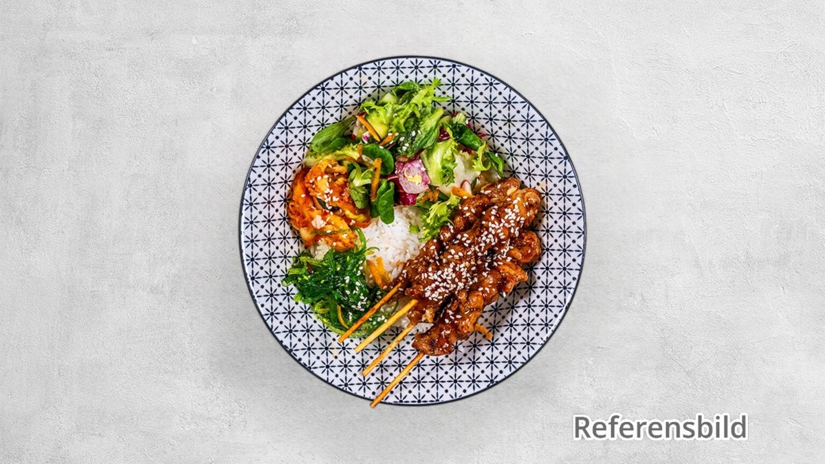 5 stycken yakitori spett, ris, sallad, teriyakisås och sesamfrön.