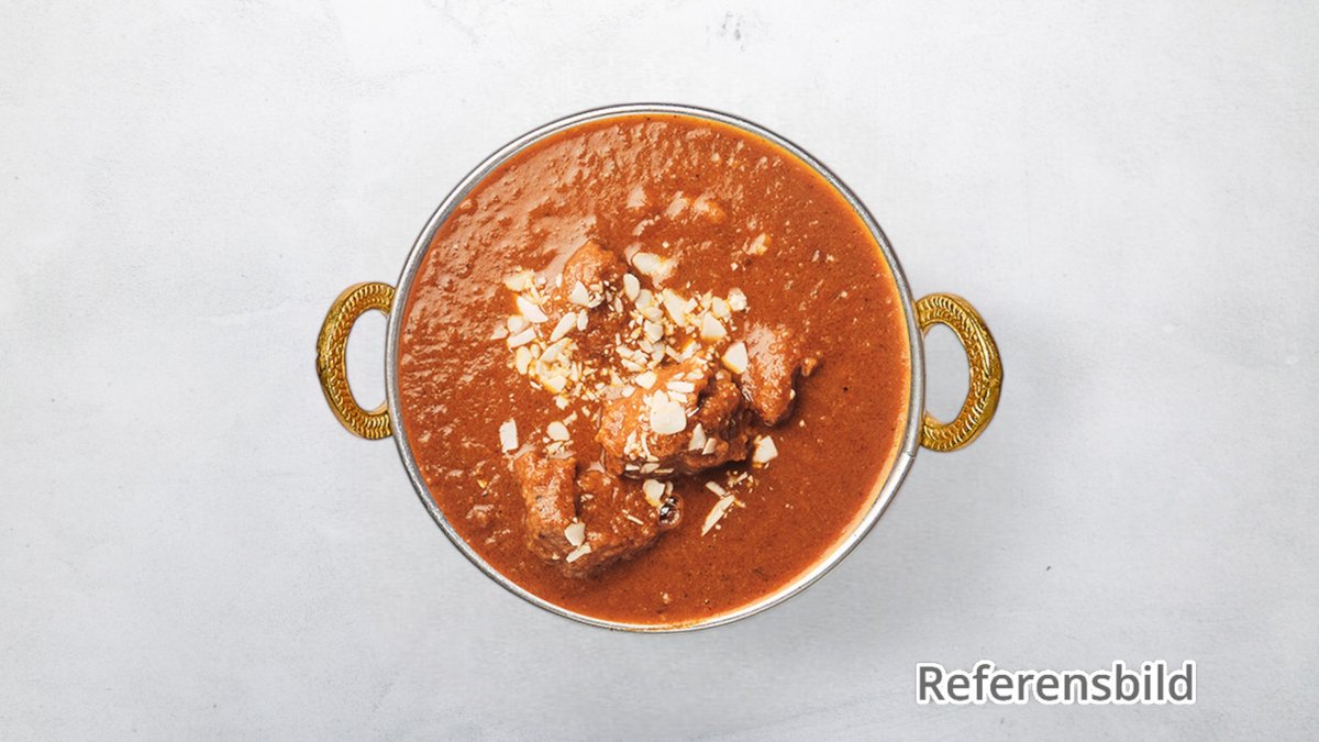 Mild. Traditionell Nordindisk lammrätt med saffran, kardemumma, rosenvatten i krämig sås, garnerad och mandel.