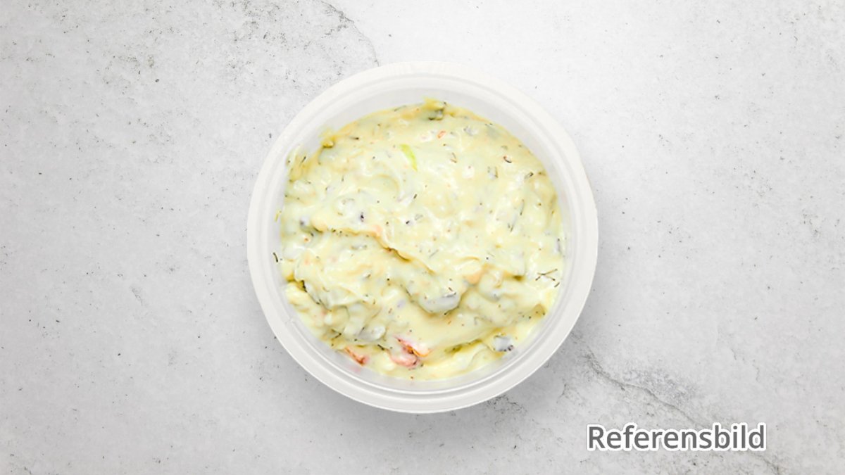 2 st vego korv, Strips och mos, Räksallad, gurkmajonäs och Rostadlök.