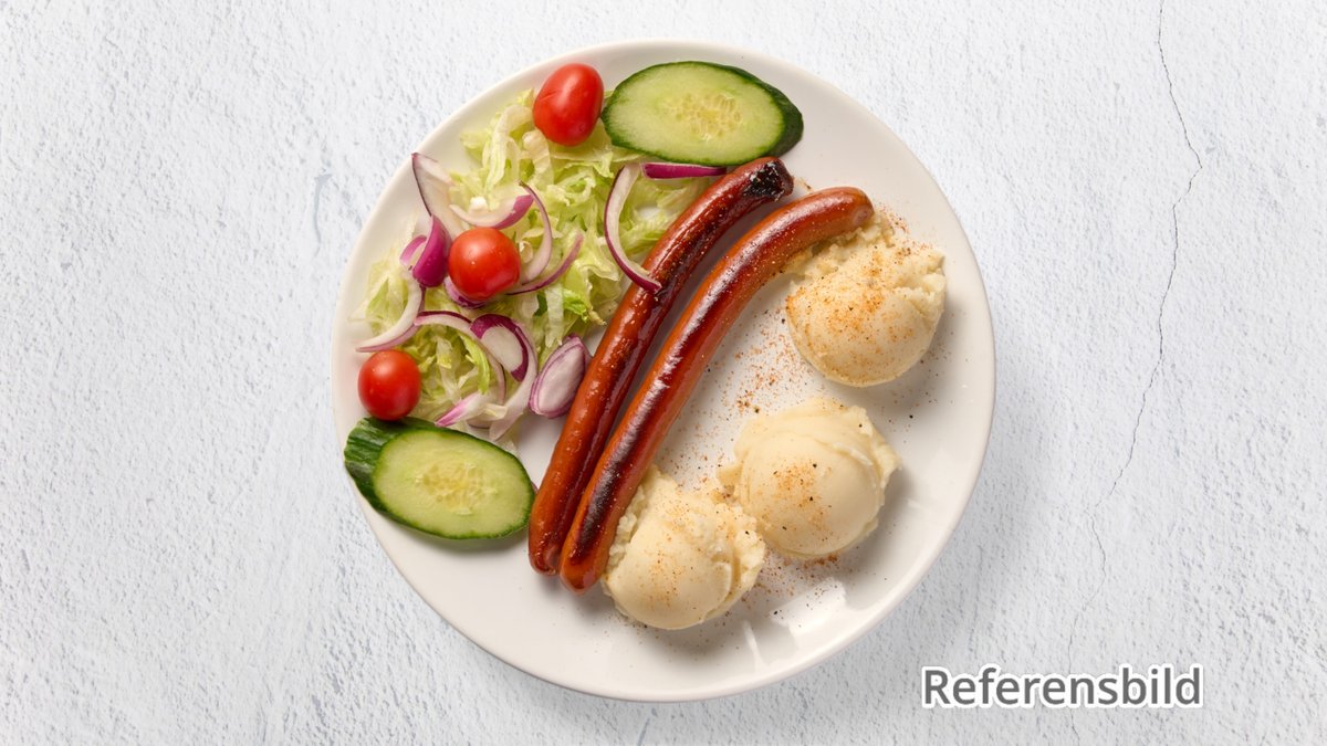 2 korvar, serveras med potatismos, pommes frites, räksallad, gurkmajonnäs och rostad lök. Välj dryck i nästa steg.