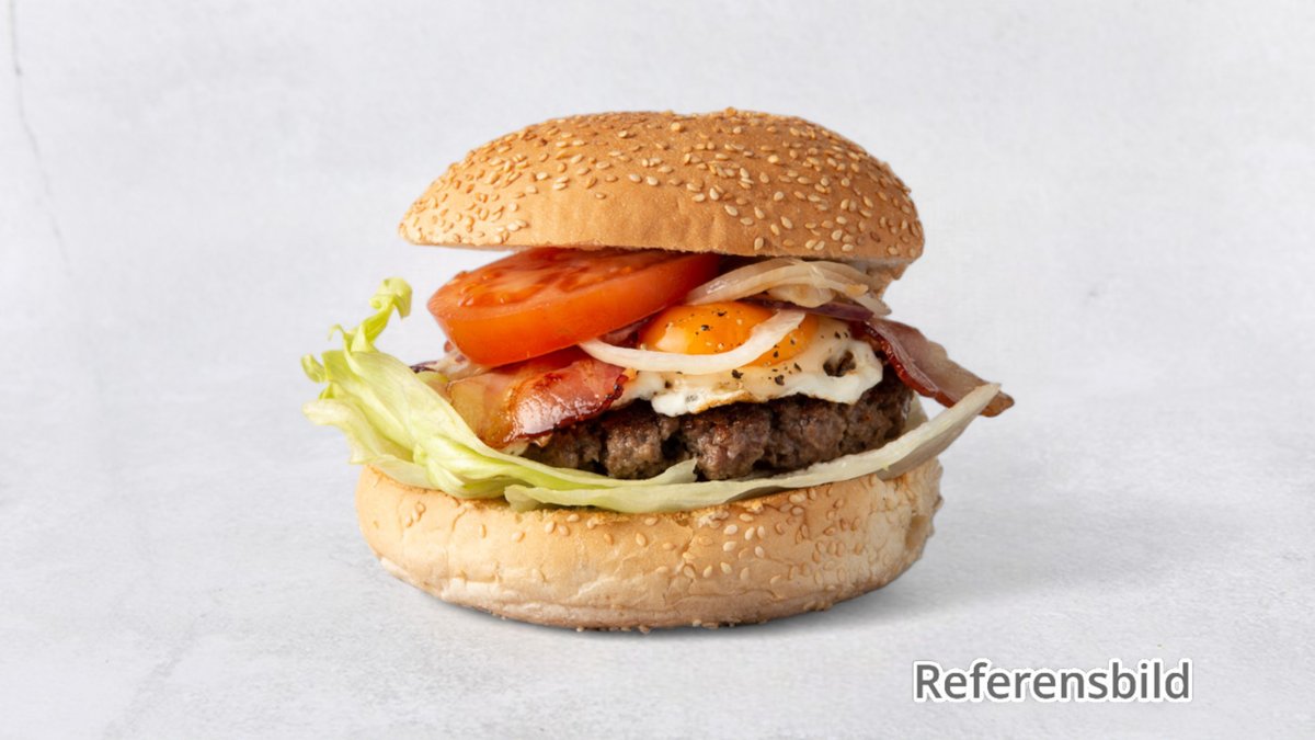 Med ägg, sallad, lök, bacon, hamburgerdressing, senap och ketchup. Välj storlek, tillbehör och dryck i nästa steg.