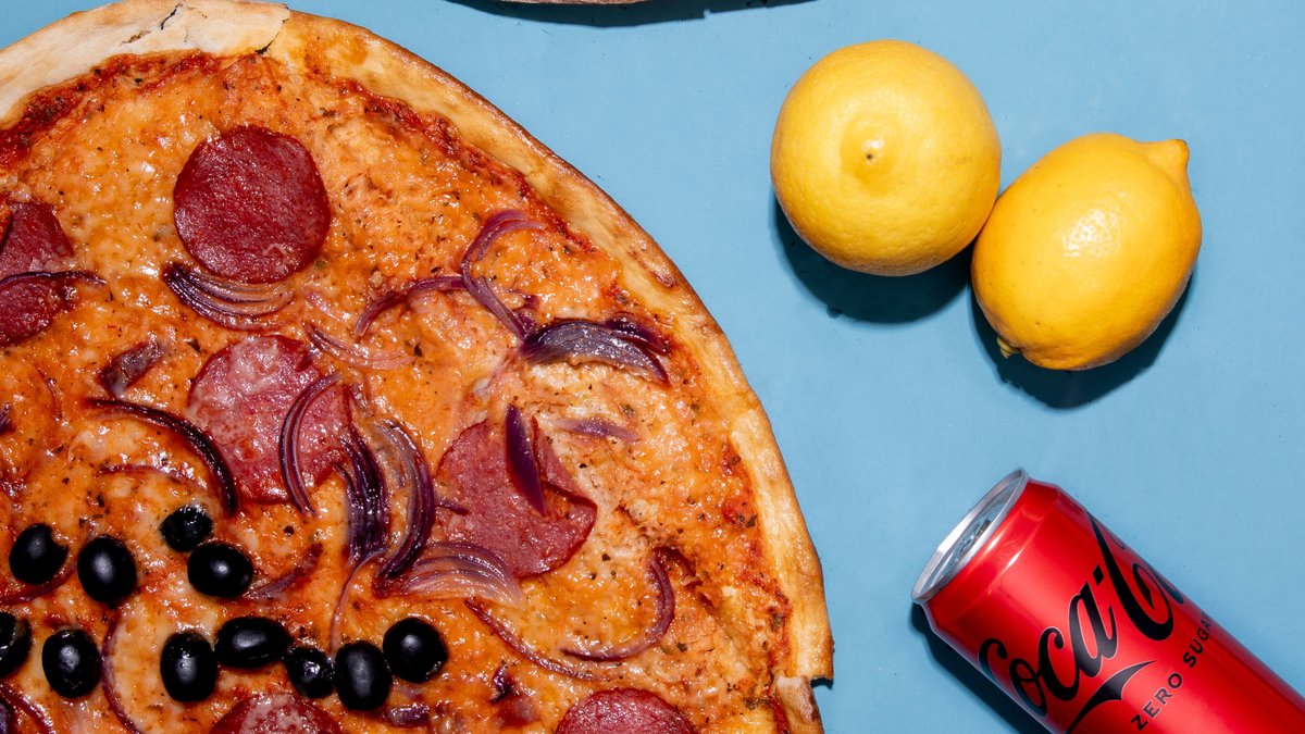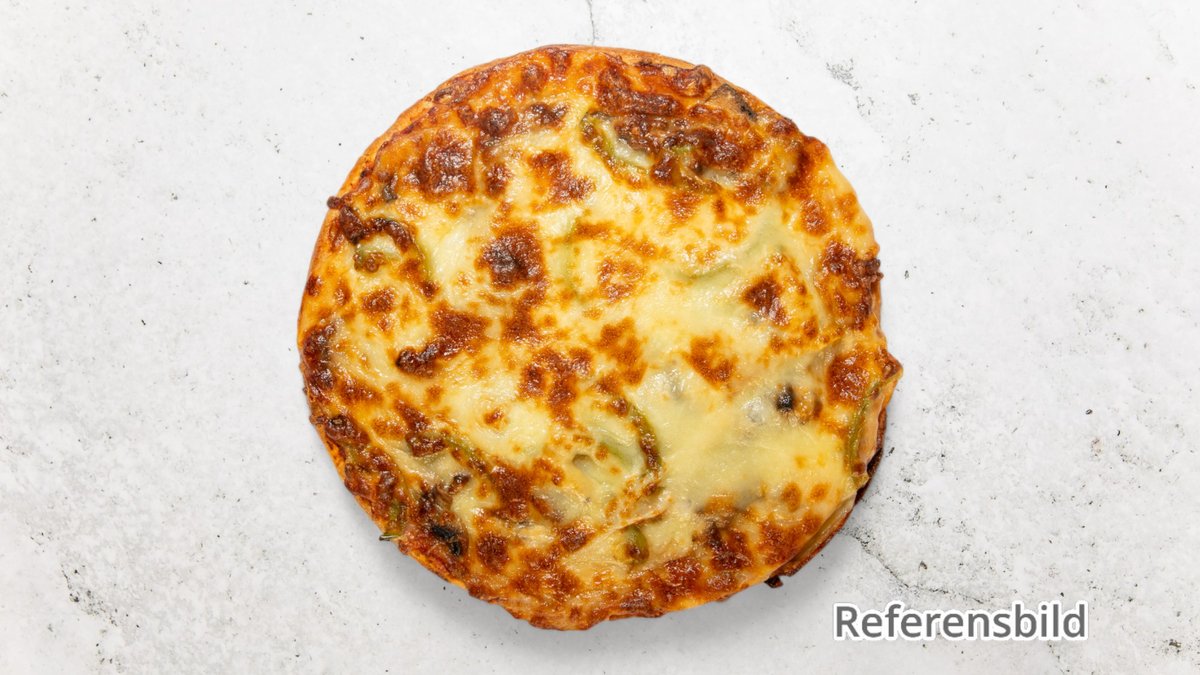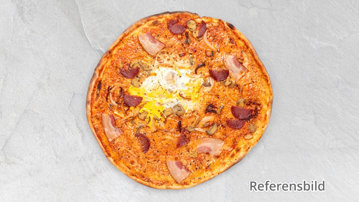 Pizza med skinka, bacon, salami, lök och mozzarellaost.