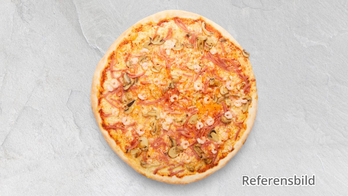 Pizza med skinka, räkor, champinjoner, musslor, oliver och kronärtskocka.