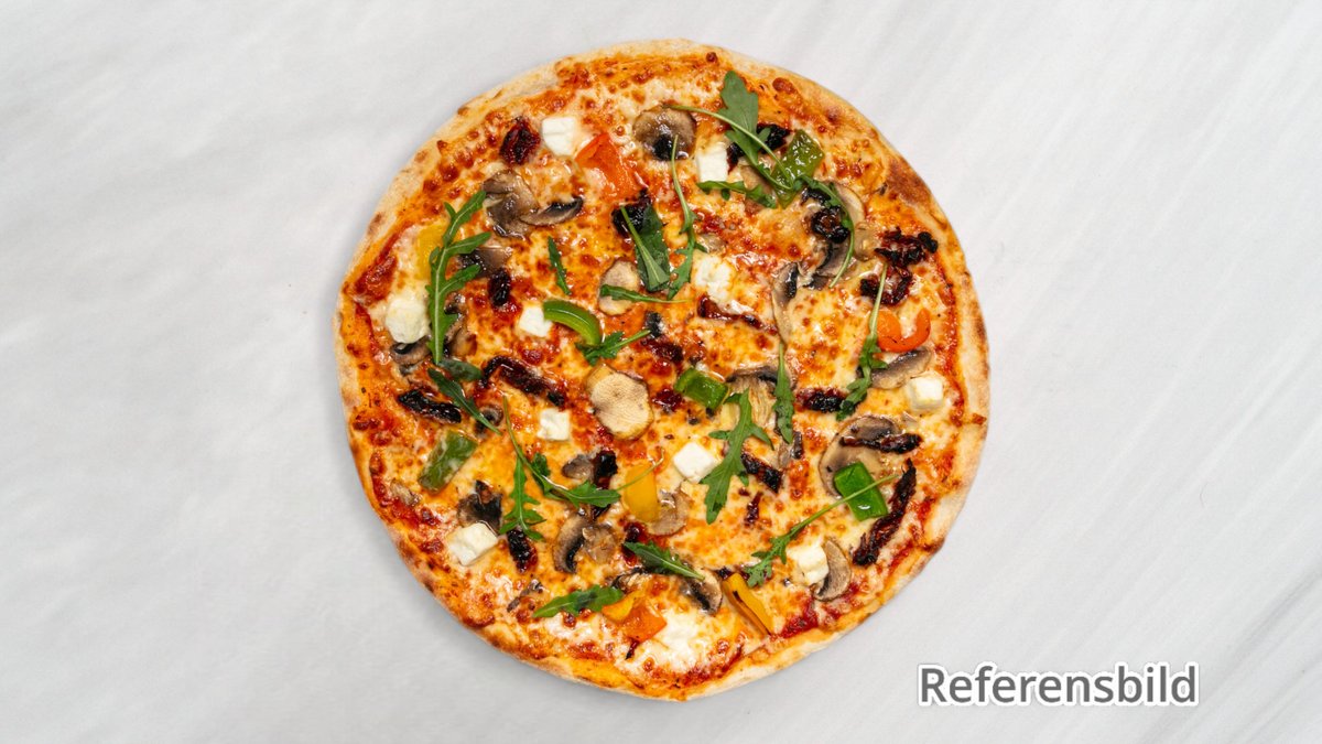 Pizza med champinjoner, soltorkade tomater, lök och gorgonzolaost.