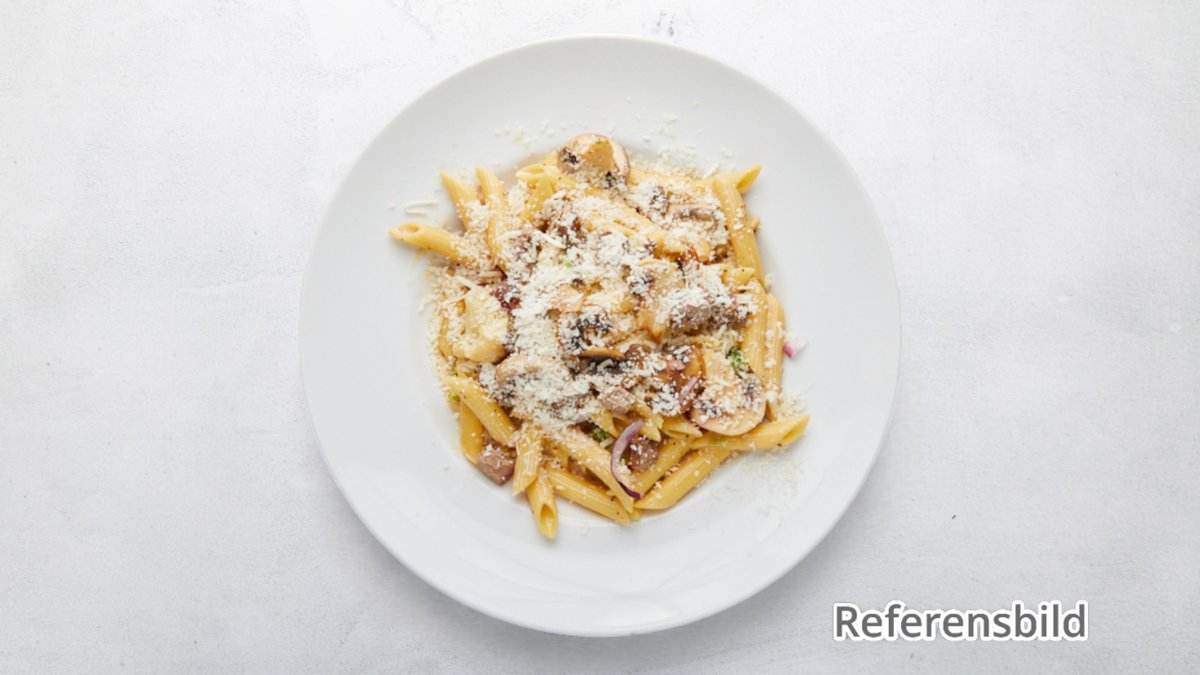 Pasta med champinjoner, lök, paprika, krämig sås och parmigiano.