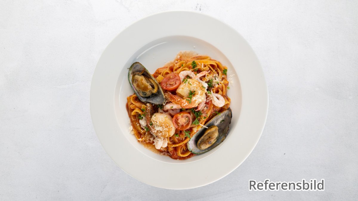 Pasta med musslor, räkor, crabfish, krämig sås och parmigiano.