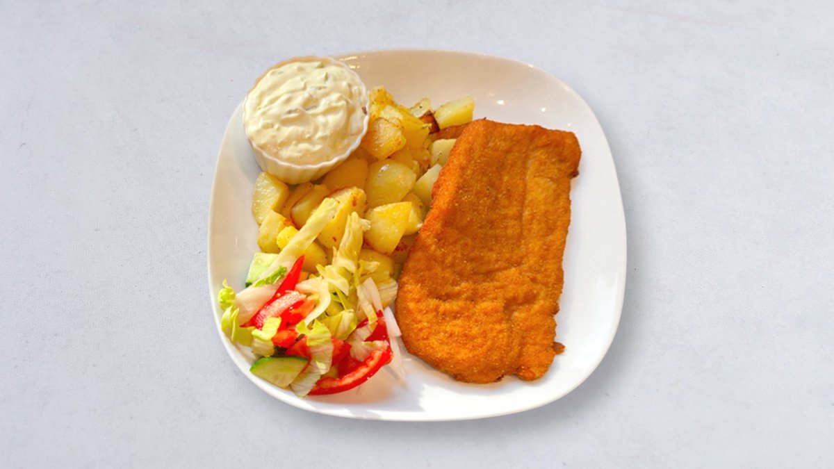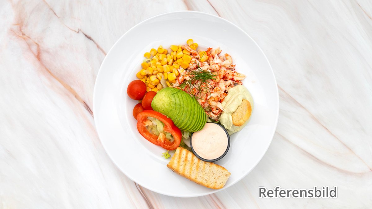 Sallad med ananas, paprika, ägg, currysås, isbergssallad, tomat, gurka, nybakat bröd och valfri sås.