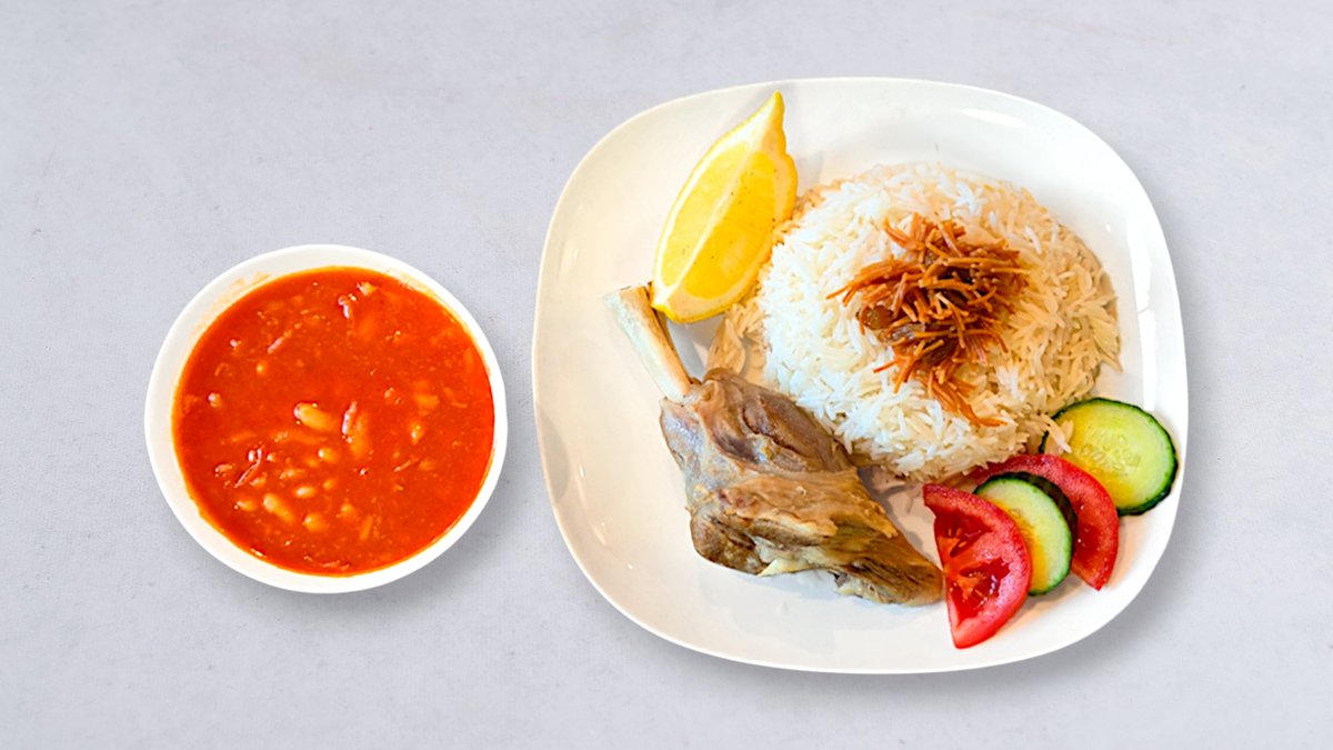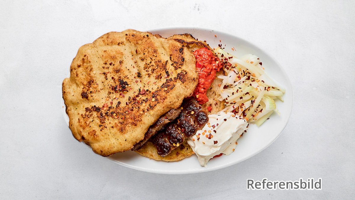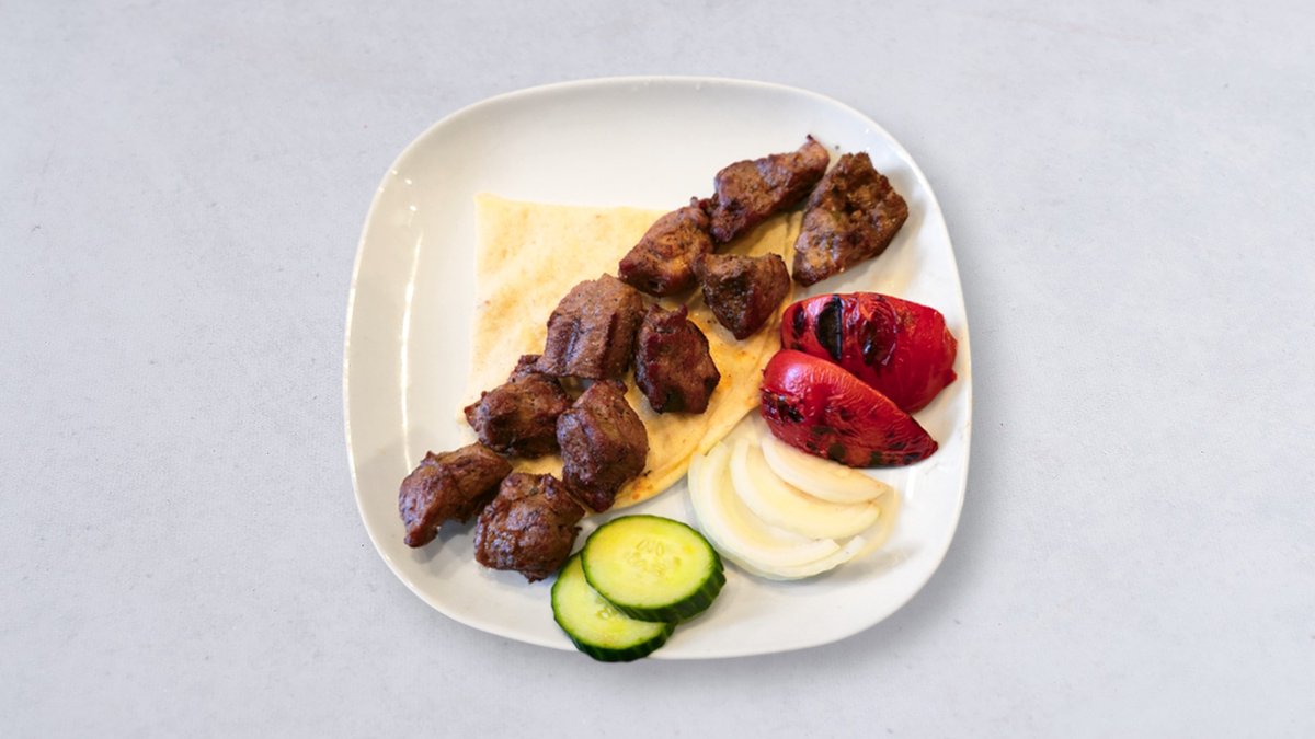 Serveras med kebabkött nötkött, isbergssallad, tomater, lök, gurka, feferoni och valfri sås.