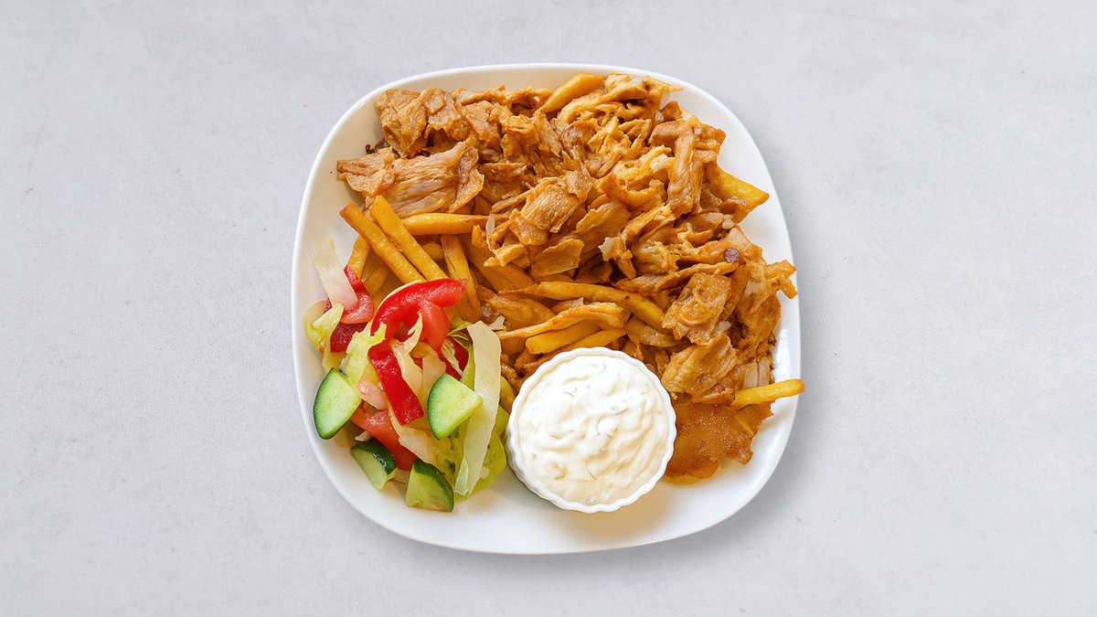 Serveras med kyckling, isbergssallad, tomater, lök, gurka, feferoni och valfri sås.