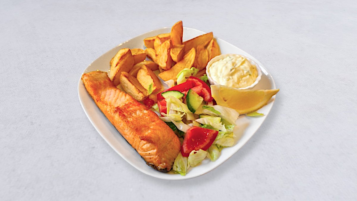 Sallad med citron, ägg, isbergssallad, tomat, gurka, nybakat bröd och valfri sås.