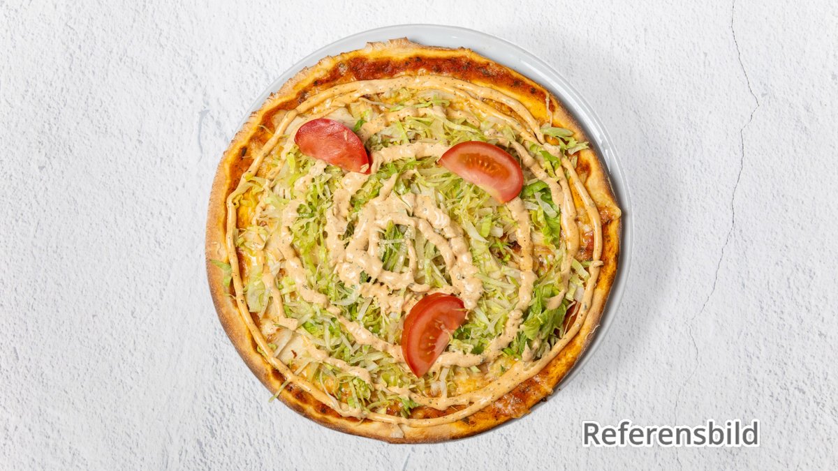 Tomatsås, ost, kebabkött, lök, tomat, bearnaisesås och valfri sås. Halvinbakad.