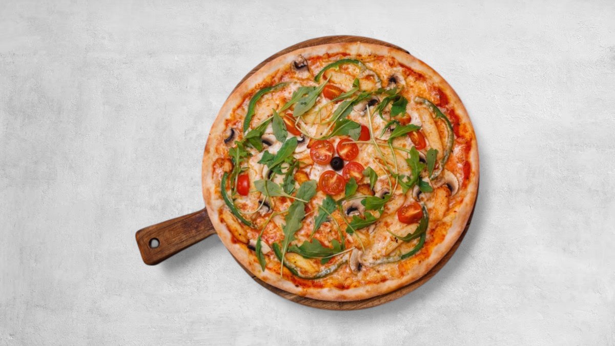 Tomatsås, mozzarella, rödlök, marinerade färska champinjoner, baby plommon tomater, grillad aubergine, oliver, färsk grön paprika och färsk babybladspenat.