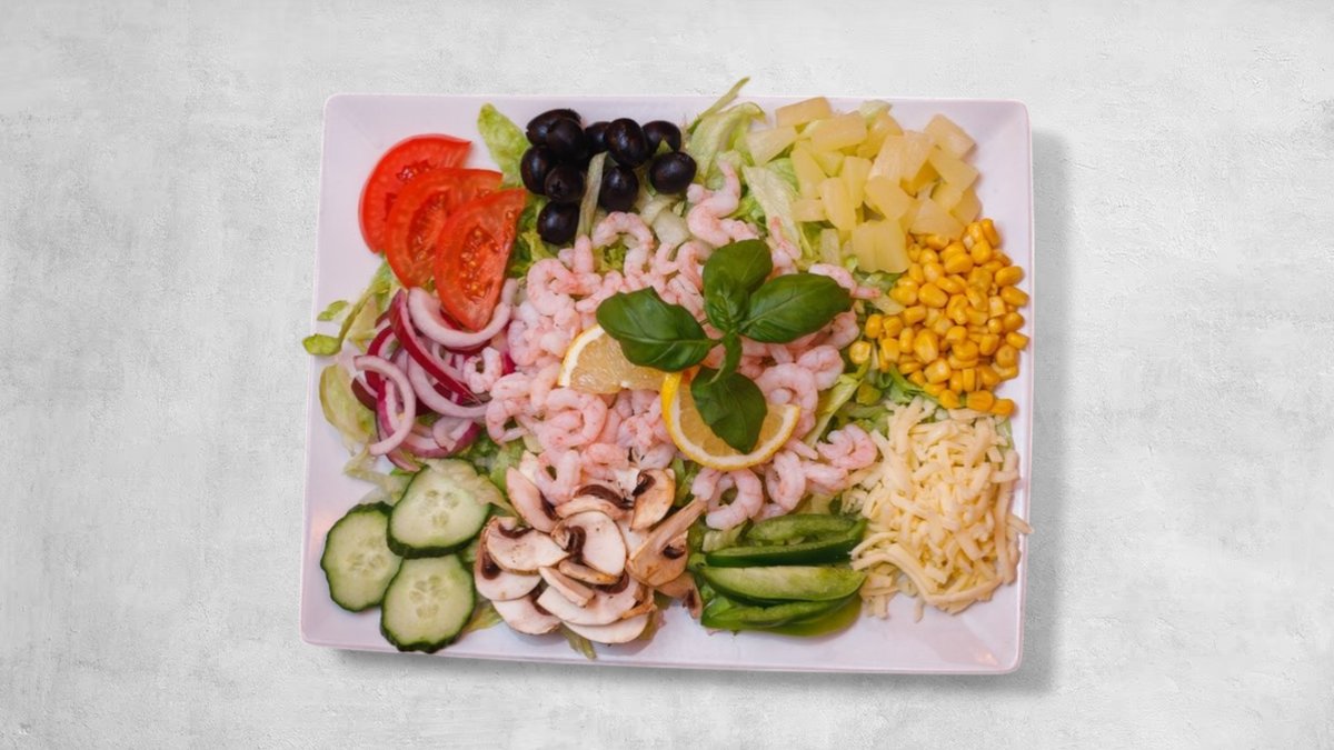 Tomatsås, ost, skinka, räkor, musslor, champinjoner och svarta oliver.