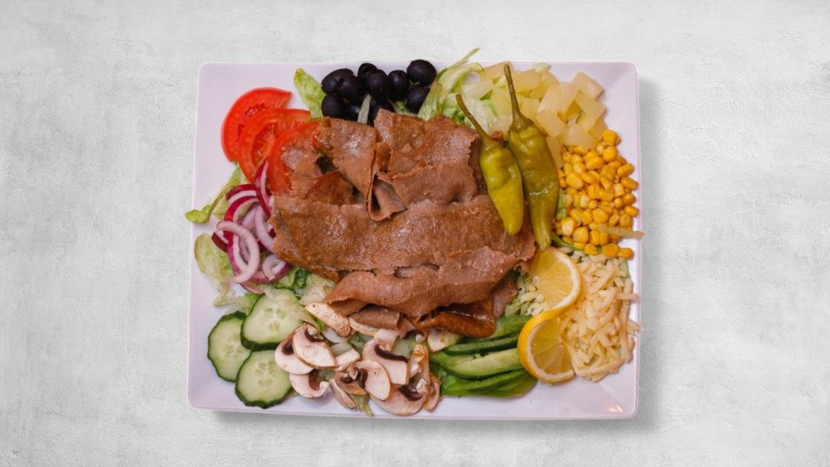Kebabkött (nötkött). Rödlök, gurka, isbergssallad, feferoni, färska tomater och valfri sås.