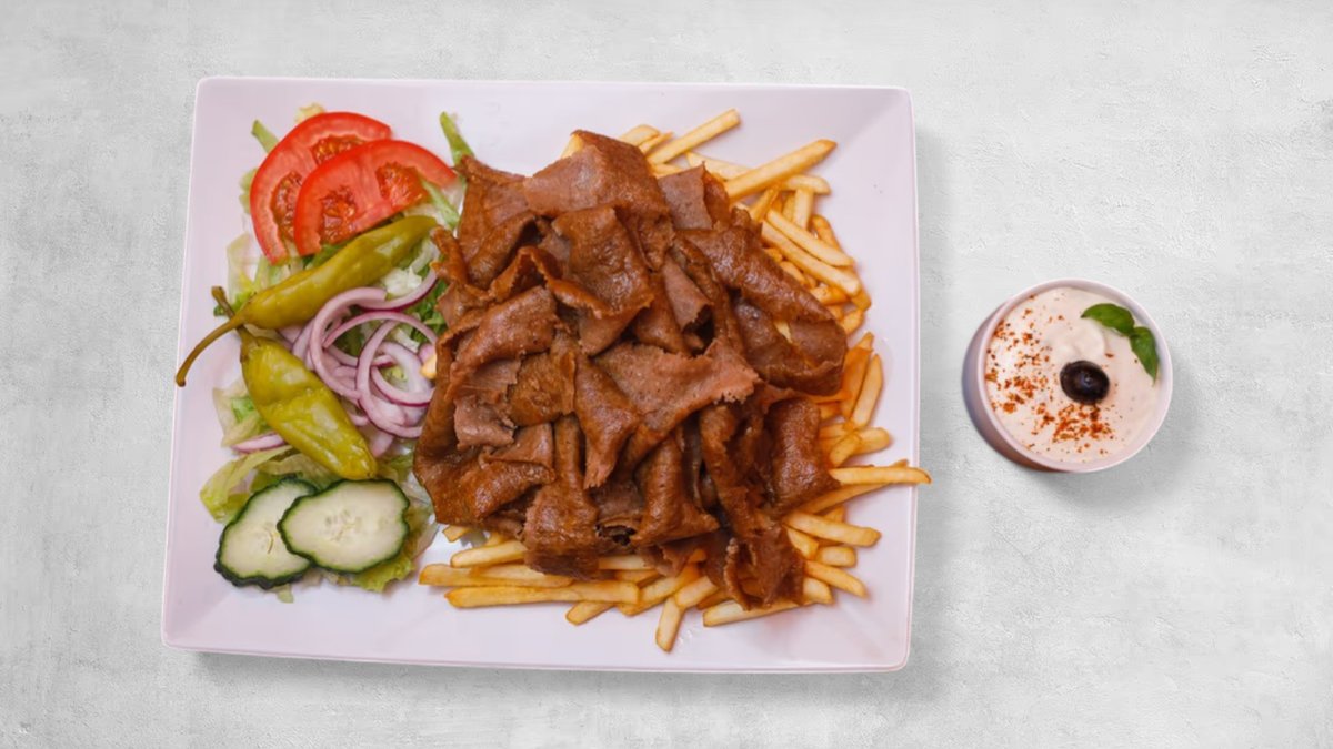 Tomatsås, ost, kebabkött (nötkött), pommes frites, gurka, isbergssallad, mild kebabsås, feferoni, färska tomater och lök.