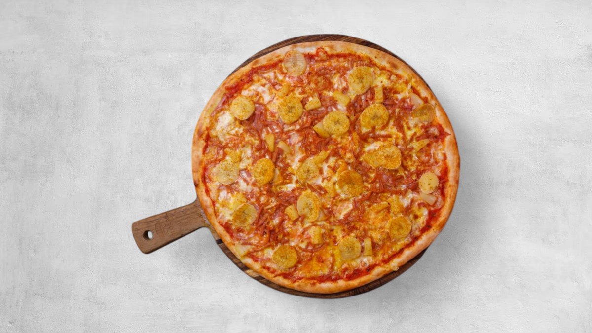 Tomatsås, ost, skinka, banan, curry och ananas.