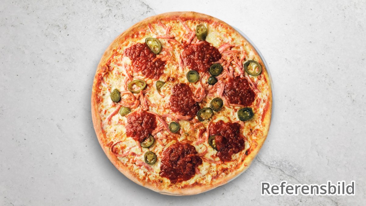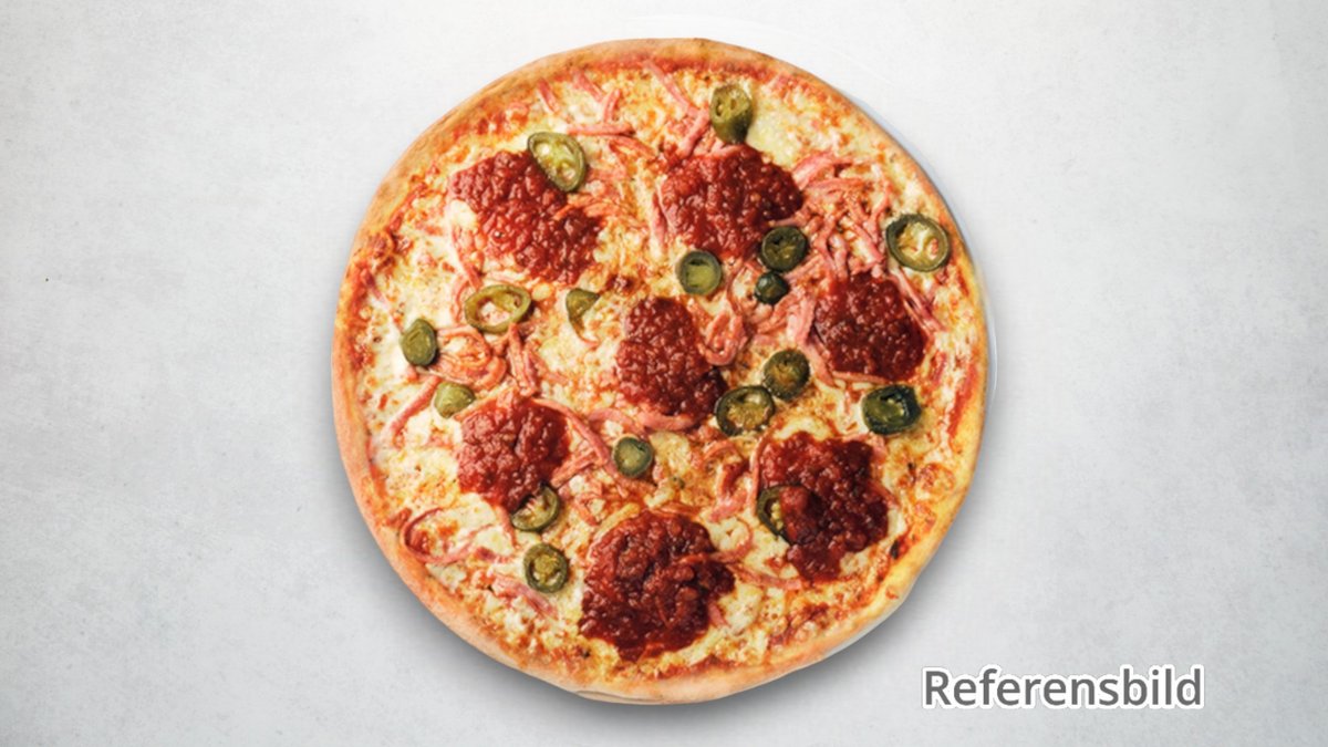 Tomatsås, ost, skinka, salami, bacon, lök, jalapeños och tacosås.