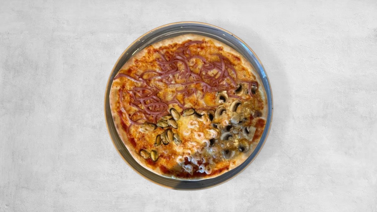Tomatsås, ost, skinka, champinjoner, fläskfilé, oxfilé och pepperoni.