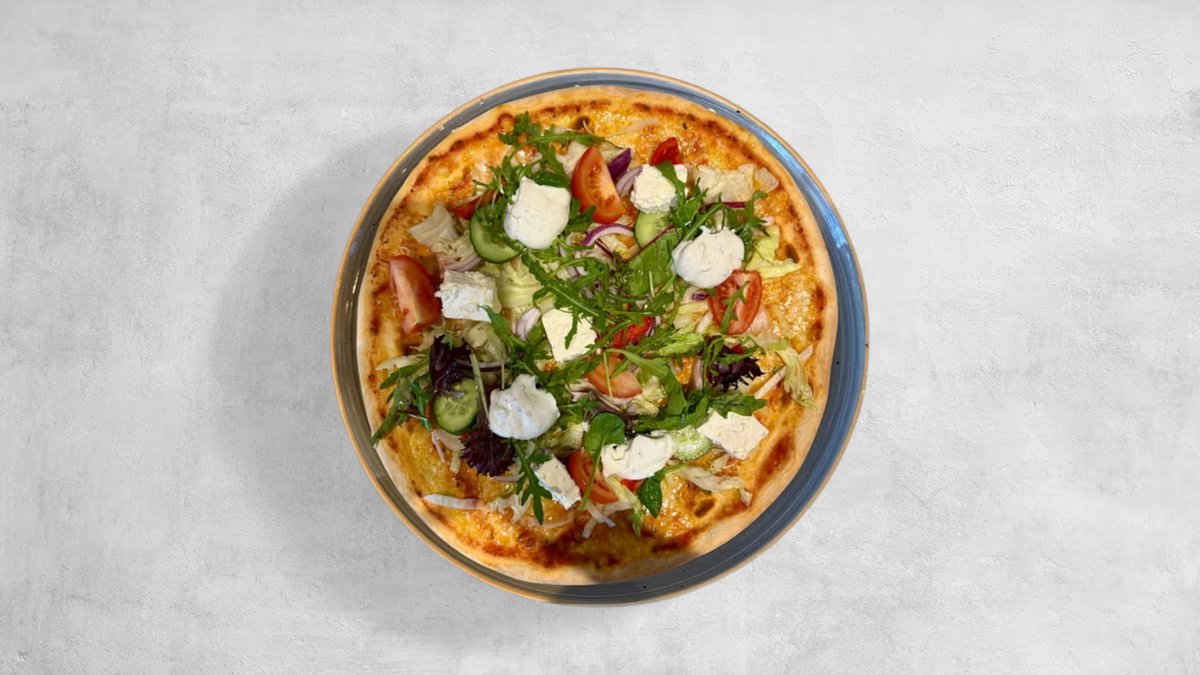 Tomatsås, ost, sallad, ruccola, tomater, gurka, paprika, rödlök och vitost med tzatziki.