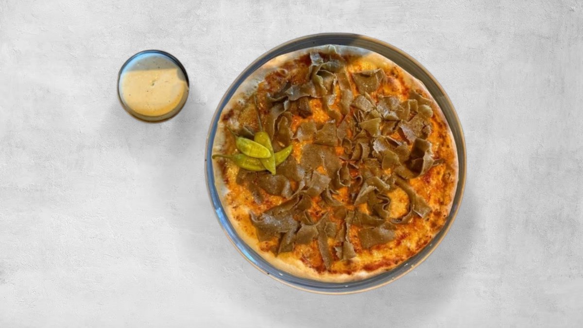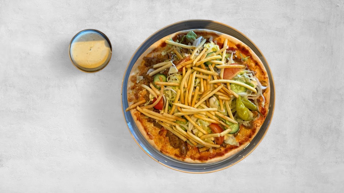 Tomatsås, ost, kebab, sallad, gurka, tomater, lök, pommes frites och pepperoni.