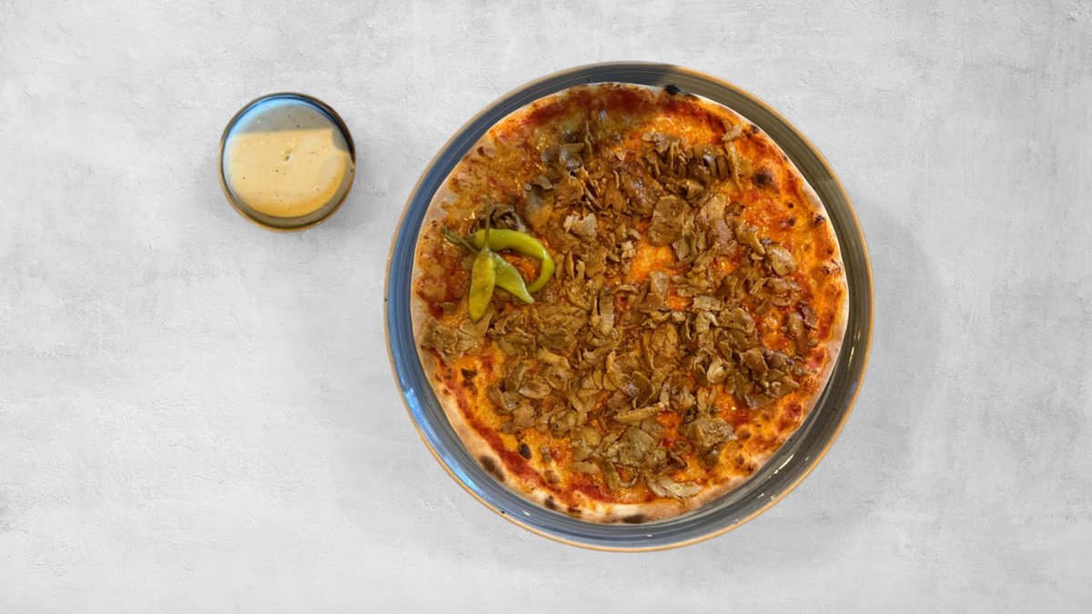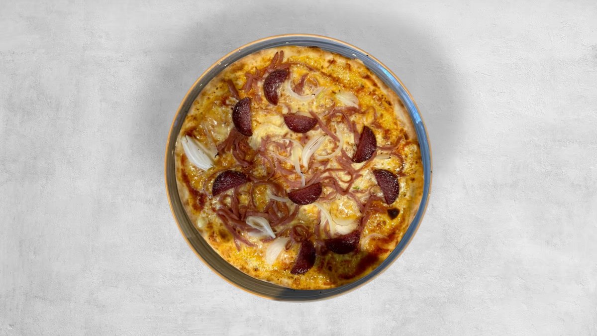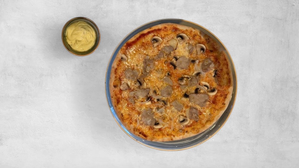 Tomatsås, ost, skinka, champinjoner, fläskfilé och lök. Dubbelinbakad.