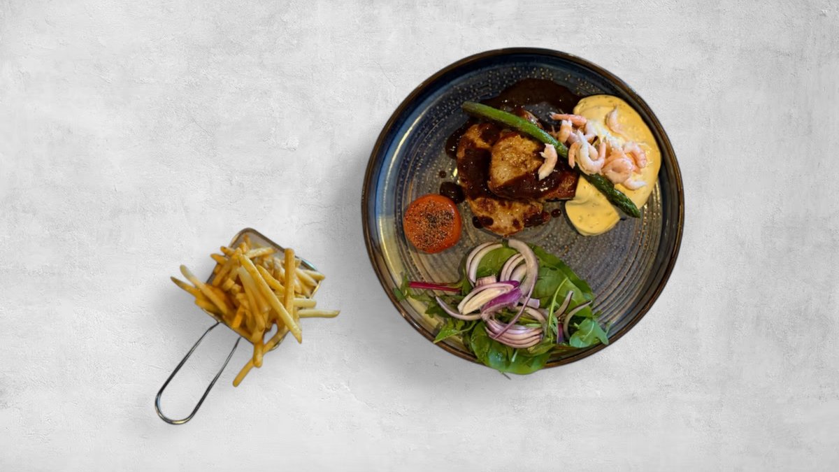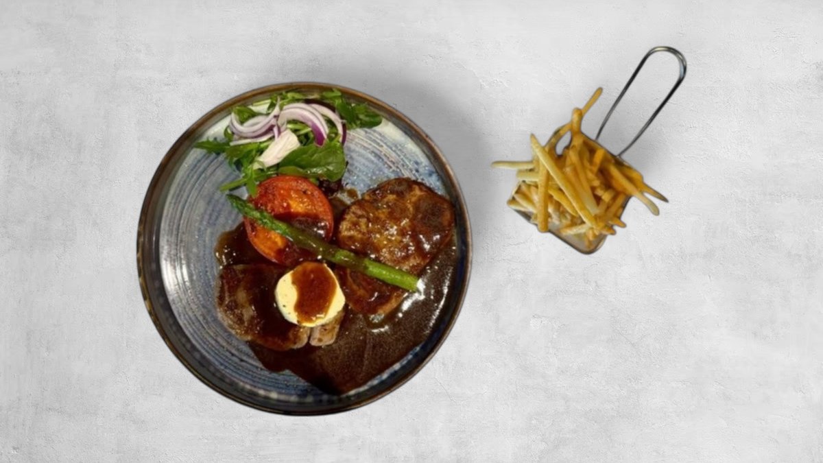 Serveras med semibakad tomat, sparris, rödvinssås & persiljesmör Välj mellan pommes frites eller klyft potatis.