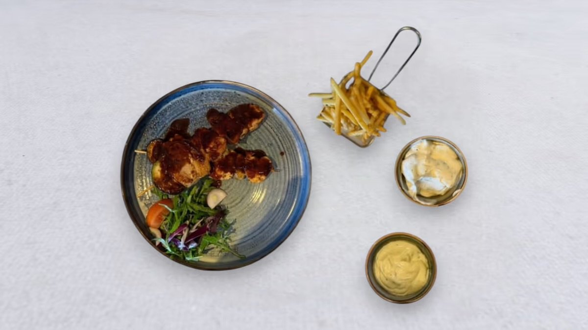 Spett med kycklingfilé och fläskfile, serveras med valfritt tillbehör och sås.