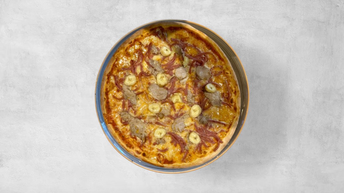 Tomatsås, ost, skinka, fläskfilé och banan.