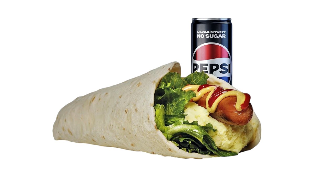 Bamsekorv 150 g, mos, isbergssallad, hackad gurka, ketchup och senap. Valfri dryck ingår.
