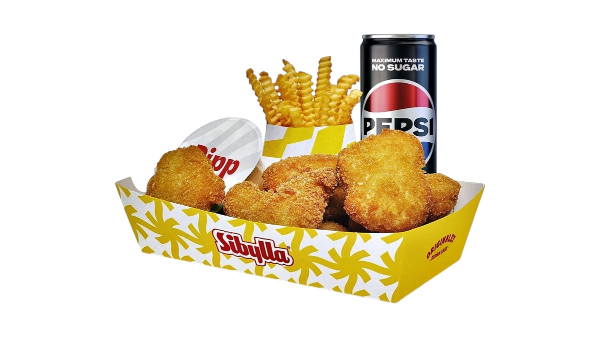 9 st kycklingnuggets och 2 st dippsåser. Valfri dryck och pommez ingår.