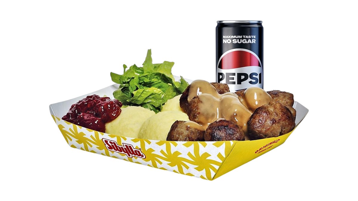 4 st köttbullar, mos, lingonsylt och valfri dryck ingår.