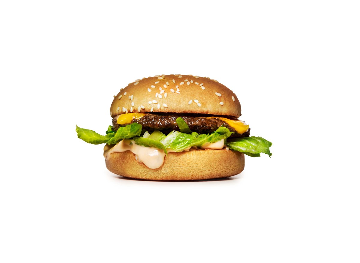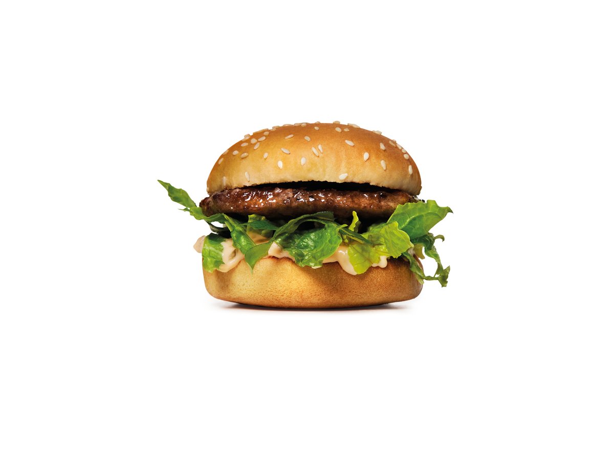 90 g hamburgare med hamburgerdressing, isbergssallad, gul lök och hamburgerost.
