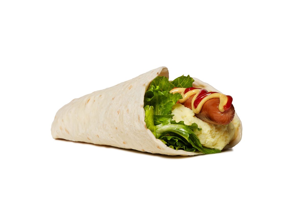 1 kokt, grillad eller sojabaserad korv, isbergssallad, ketchup, senap och mos. Valfri dryck ingår.