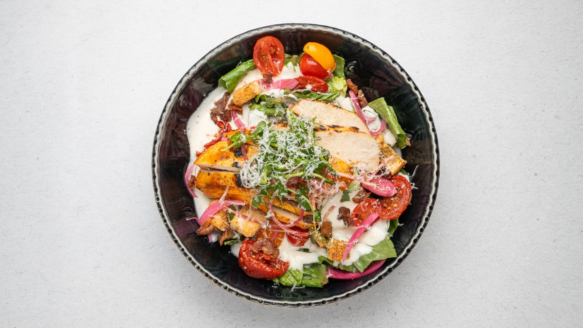 Grillad kyckling, pancetta sidfläsk, parmesan & krutonger.