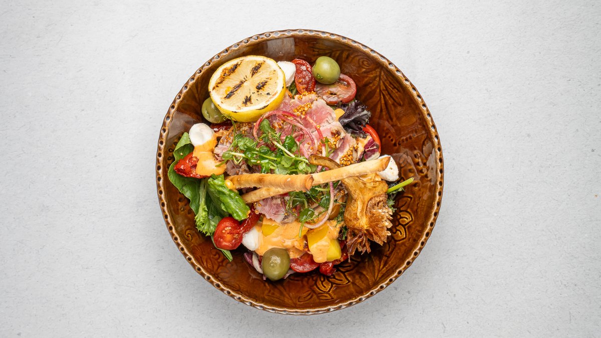 Lättgrillad tonfisk, mango, oliver, chili, mozzarella och kimchisesam.