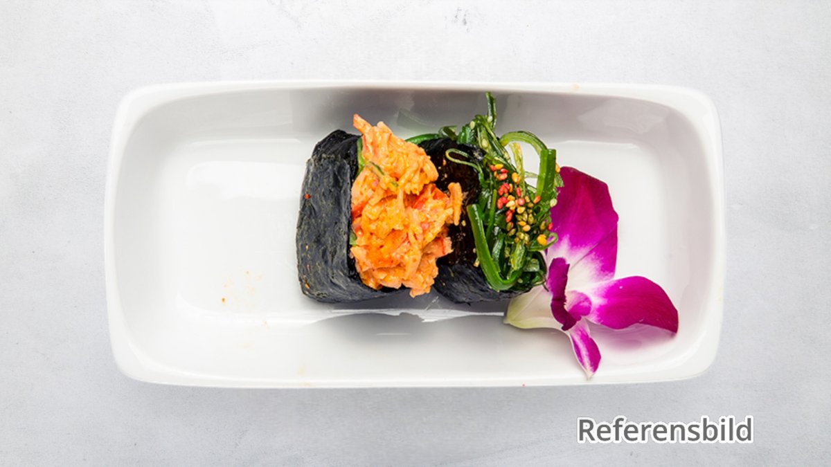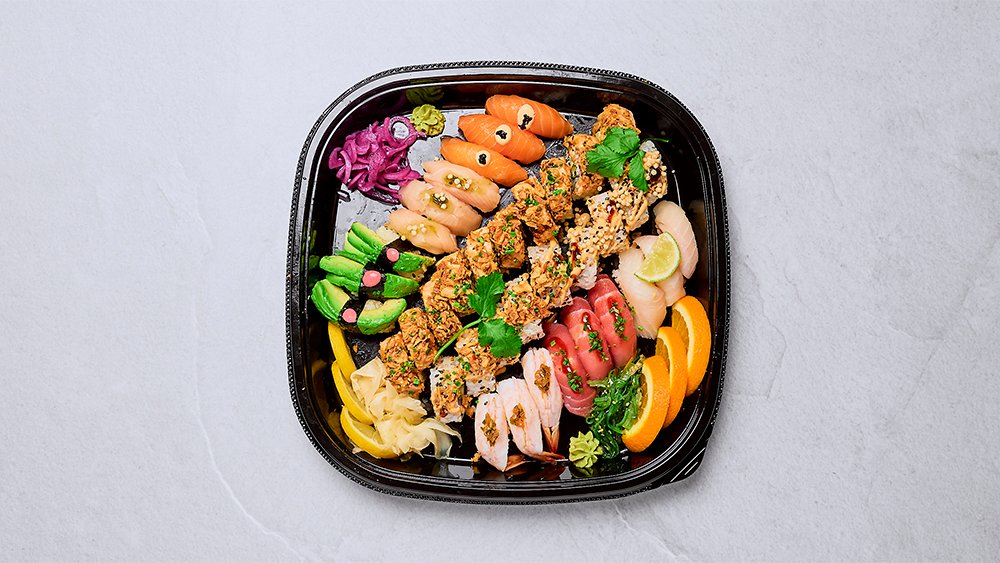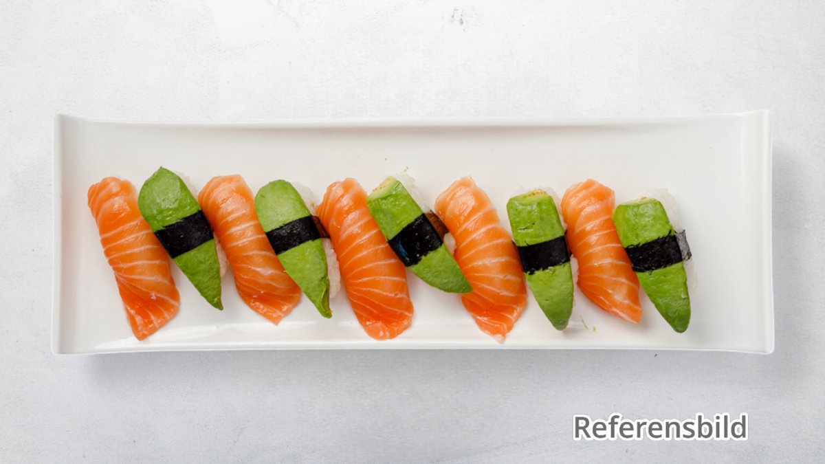 10 laxnigiri, 4 avokadonigiri, 4 tonfisknigiri, 4 vitfisknigiri, 4 räknigiri, 4 musslornigiri, 5 spicy california roll, 5 california roll och 10 räkor tempura roll.