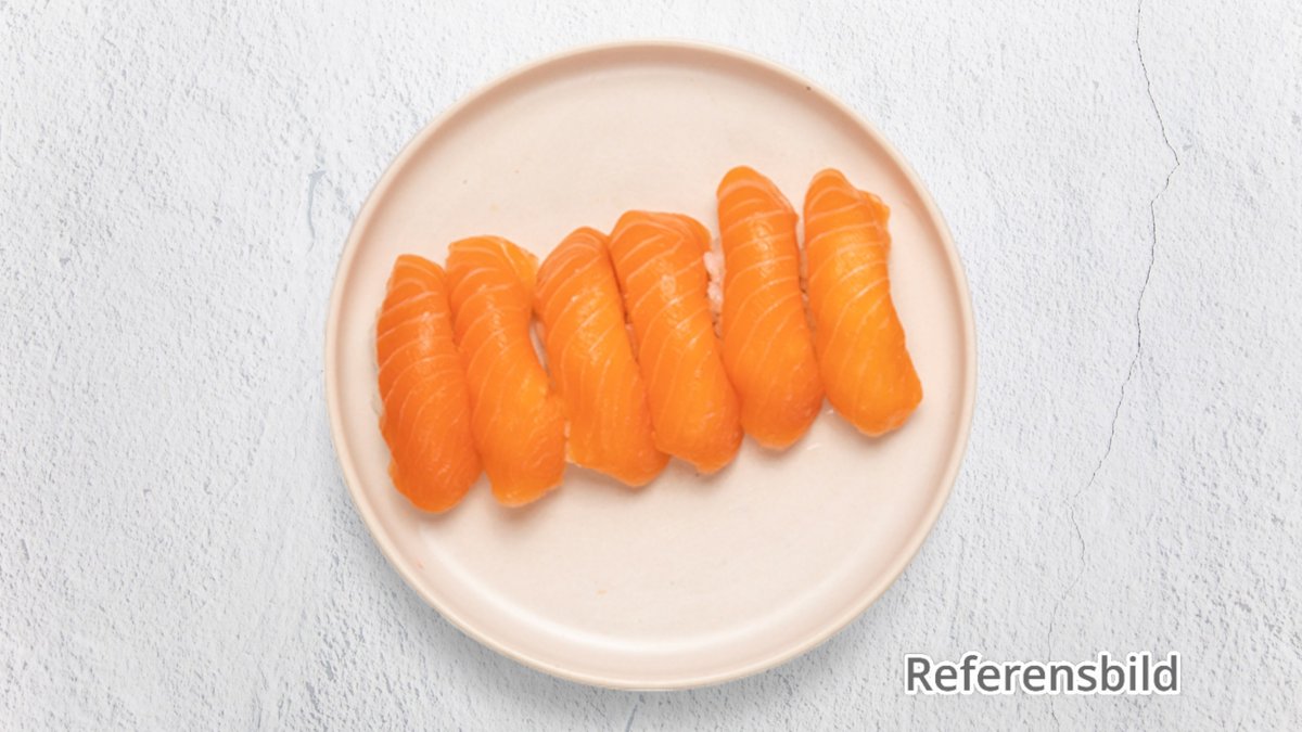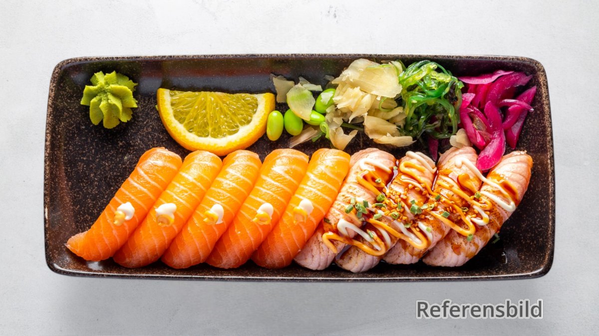10 lax, 6 flamberad lax, 7 räkor, 7 avokado, 5 california roll, 5 spicy california roll och 10 räkor tempura roll.