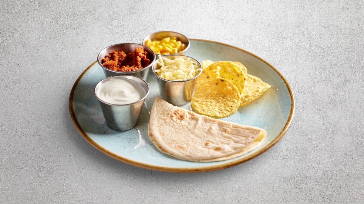 Tortillas fyllda med ost, bönor, sallad, hot-sås, gräddfil och valfri fyllning. Välj mellan köttfärs, kyckling (serveras med guacamole), Texas Chili eller Chili Veggie (soyafärs).