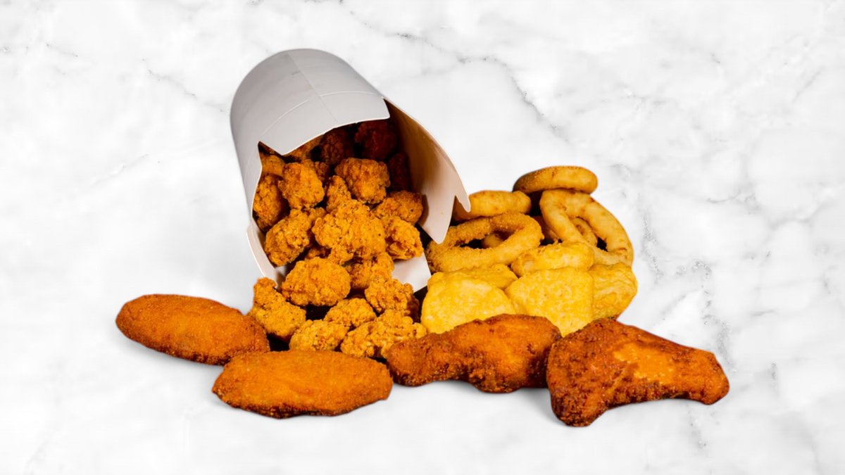 8 st krispiga strimlade kycklingfilé, 4 st krispiga kycklingklubbar, 8 st krispiga kycklingvingar, 4 st krispiga mozzarella stick, 8 st nuggets och 8 st lökringar. Pommes coleslaw och vitlöks creme.