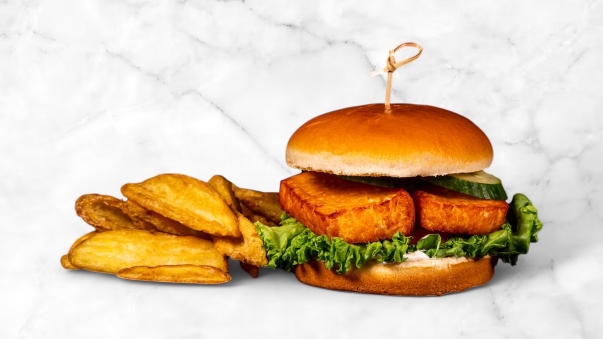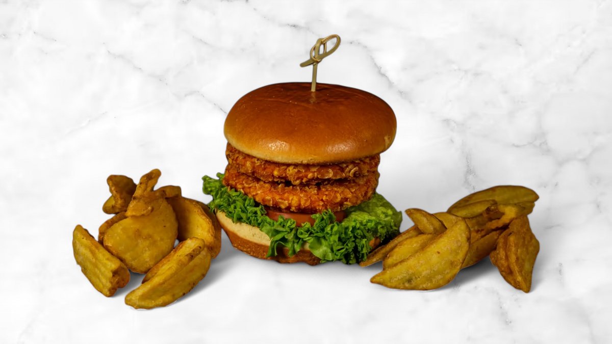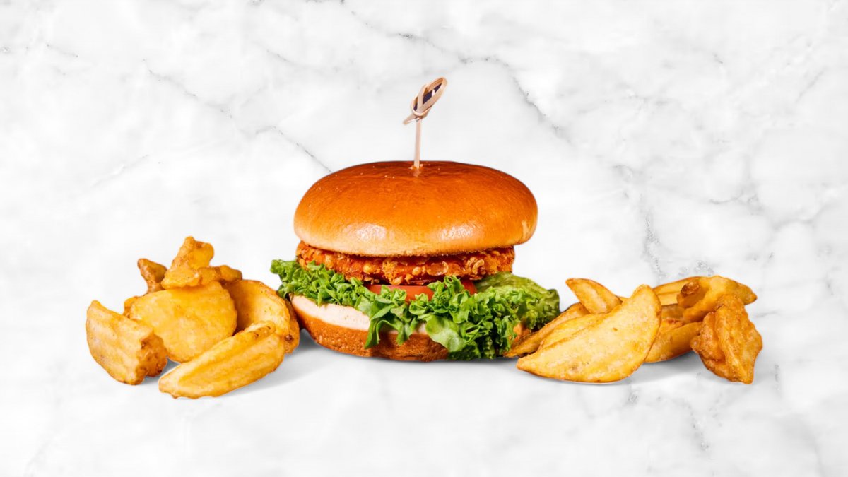 Knaprig krispig kycklingburgare med krispig sallad, tomat, vitlöksdressing och krispig pommes.